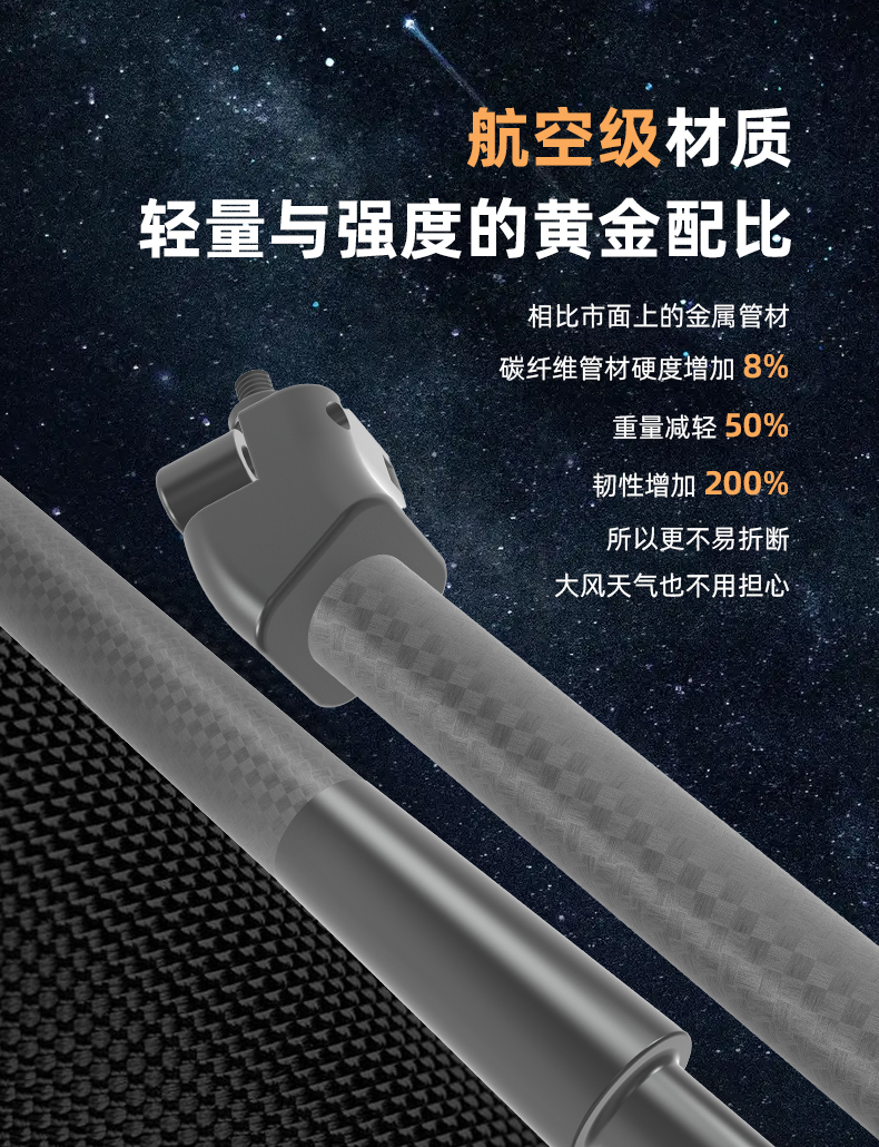 采用航空级 T700 碳纤维复合材料与环氧树脂精密复合而成,这款伸缩杆将「轻质」与「高强」两大核心优势完美融合。通过多节精密嵌套设计,实现长度自由调节与便捷收纳的平衡,搭配自主研发的锁止系统与人体工学结构,广泛适配户外露营、摄影创作、园林养护、应急作业等多元场景,为专业需求与日常使用提供兼具稳定性与便携性的解决方案。